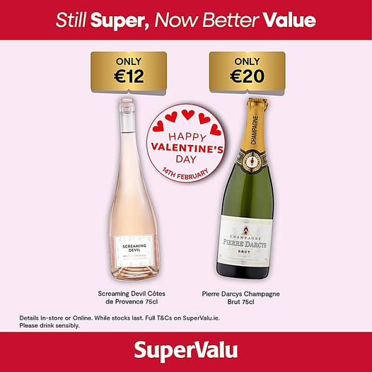 Valentine’s, Galentine’s or just celebrating being together. Pierre Darcy Champagne €20 and Screaming Devil Côtes de Provence €12 make it easy to add something special to the night. Shop online and we’ll deliver to our door![]()