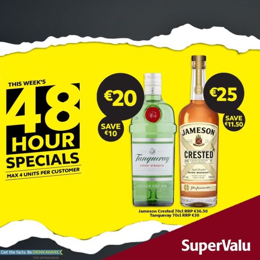 🚨 48 HOURS ONLY 🚨in Supervalu Jameson Crested 70cl ONLY €25 Tanqueray 70cl ONLY €20 🛒 Offers available on Thursday 13th & Friday 14th of June.