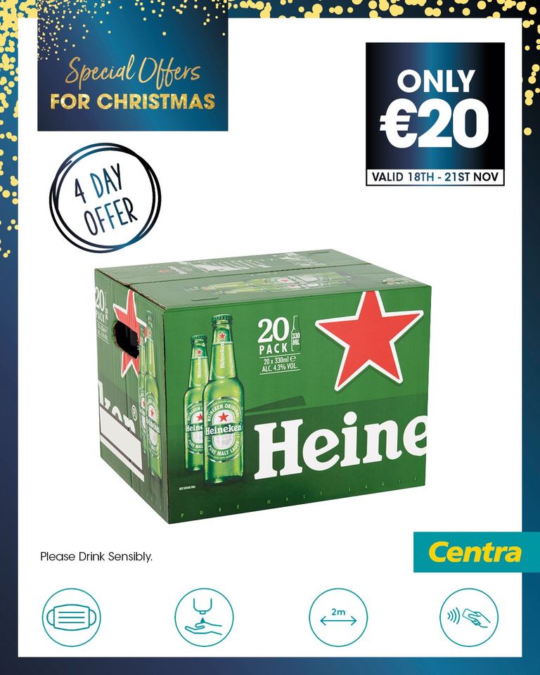 Posted on November 18, 2021November 18, 2021 by Padraic GuilfoyleCheap Heineken Alcohol @Centra Centra Ireland3 h · 4 Day Offer Heineken Bottle Pack 20 x 330ml – was €24.50.Offer available in participating stores, while stocks last.Over 18s only, please drink sensibly. Share this: Share on X (Opens in new window) X Email a link to a friend (Opens in new window) Email Print (Opens in new window) Print Share on Reddit (Opens in new window) Reddit Share on Pinterest (Opens in new window) Pinterest Share on Tumblr (Opens in new window) Tumblr Share on LinkedIn (Opens in new window) LinkedIn Share on Pocket (Opens in new window) Pocket Share on yahoo (Opens in new window) yahoo Share on Facebook (Opens in new window) Facebook Like Loading...