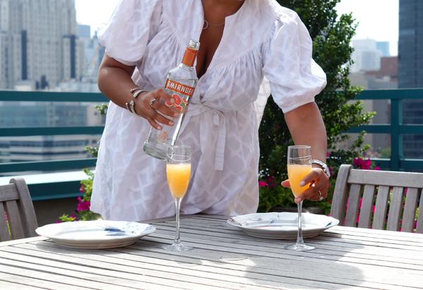 Glam woman, rooftop, two glasses. Bottle of Smirnoff vodka. Reckless!